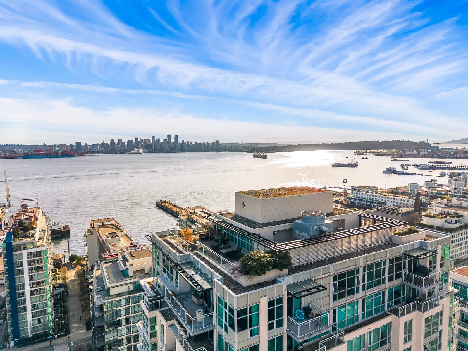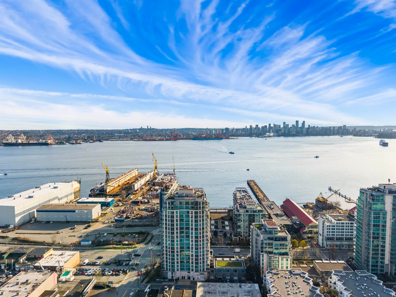 CITY SKYLINE/WATER VIEW! Enjoy the expansive views - from sunrises in the East to gorgeous sunsets over the Lions Gate. This 2BR/2BA + den suite is south facing with floor to ceiling windows and a sunny balcony. With one of the best floorplans in the building, this unit features a truly spacious living/dining area. Cook with a view in the open kitchen featuring a gas stove and stainless steel appliances. The large primary bedroom has a sliding door to the balcony and features a walkthrough closet to an ensuite bathroom w/ soaker tub and shower. With insuite laundry, A/C, parking, storage, 1 pet, concierge, EV charging and access for a fee to the Pinnacle Hotel pool, gym, hot tub. All in a great building just steps from the iconic Shipyards and the great community events in Lower Lonsdale.